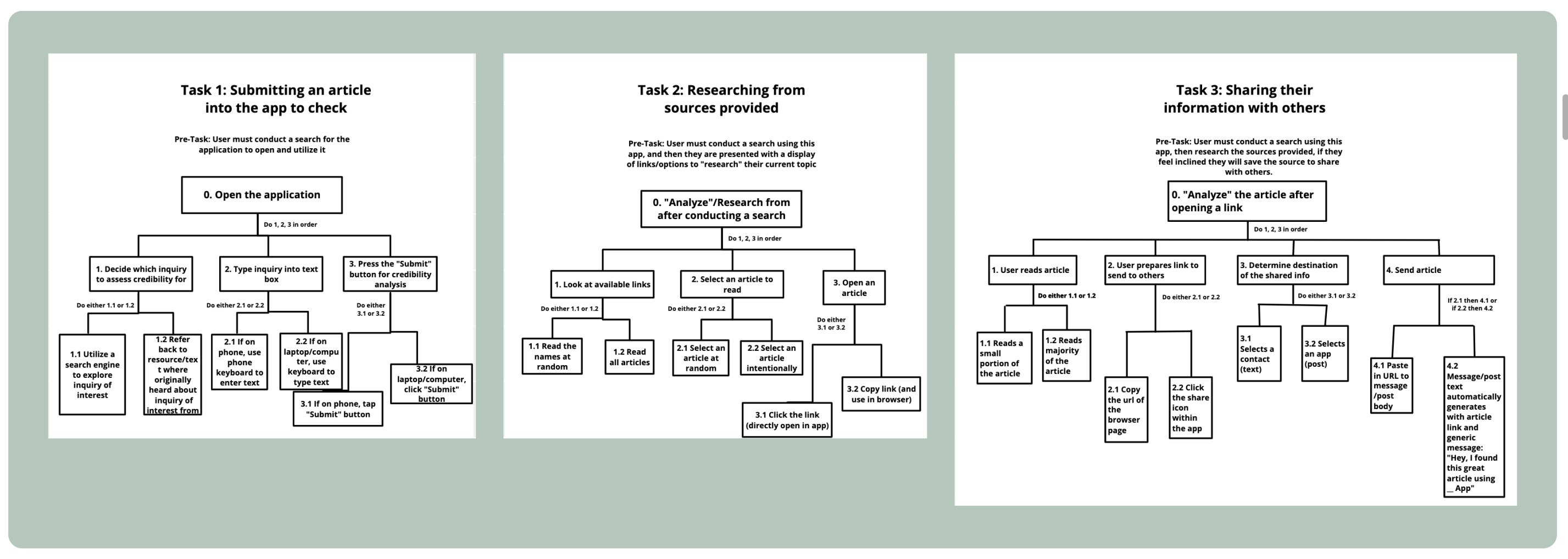 Brainstorning the User JourneyAt this phase of development, our team decided to focus on helping users identify "fake news" when using the internet in general. We identified 3 high level tasks within the problem domain: submitting an article into the app to check its credibility, researching the credible sources provided, and sharing this information with others. Through mapping out the user's steps, we were able to simplify their journey and help them reach the goals of the product more efficiently.