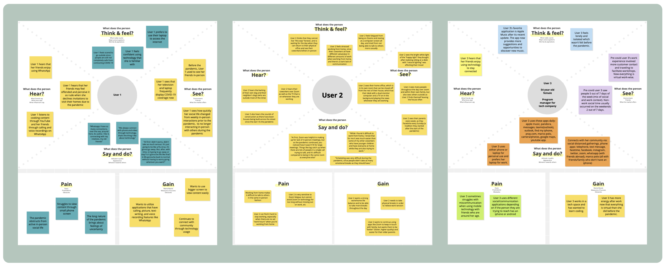 Idenitfying the Target MarketAfter choosing our target population of people ages 40 to 60, we conducted discussion based interviews with 3 people who fit the criteria. These conversations loosely followed a predetermined list of questions geared towards understanding their experiences and feelings related to the pandemic and technology use. From these interviews we constructed empathy maps to visualize what the users think, feel, say, and do.