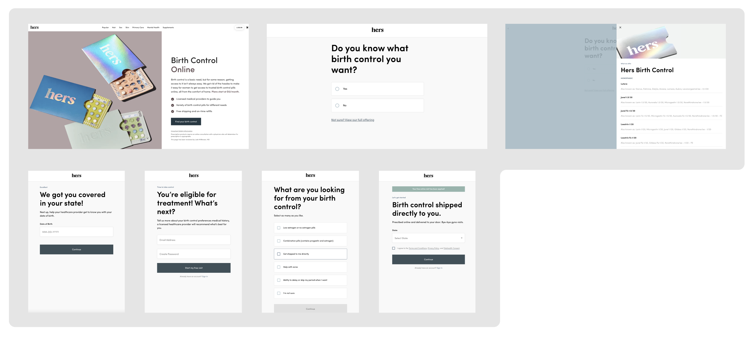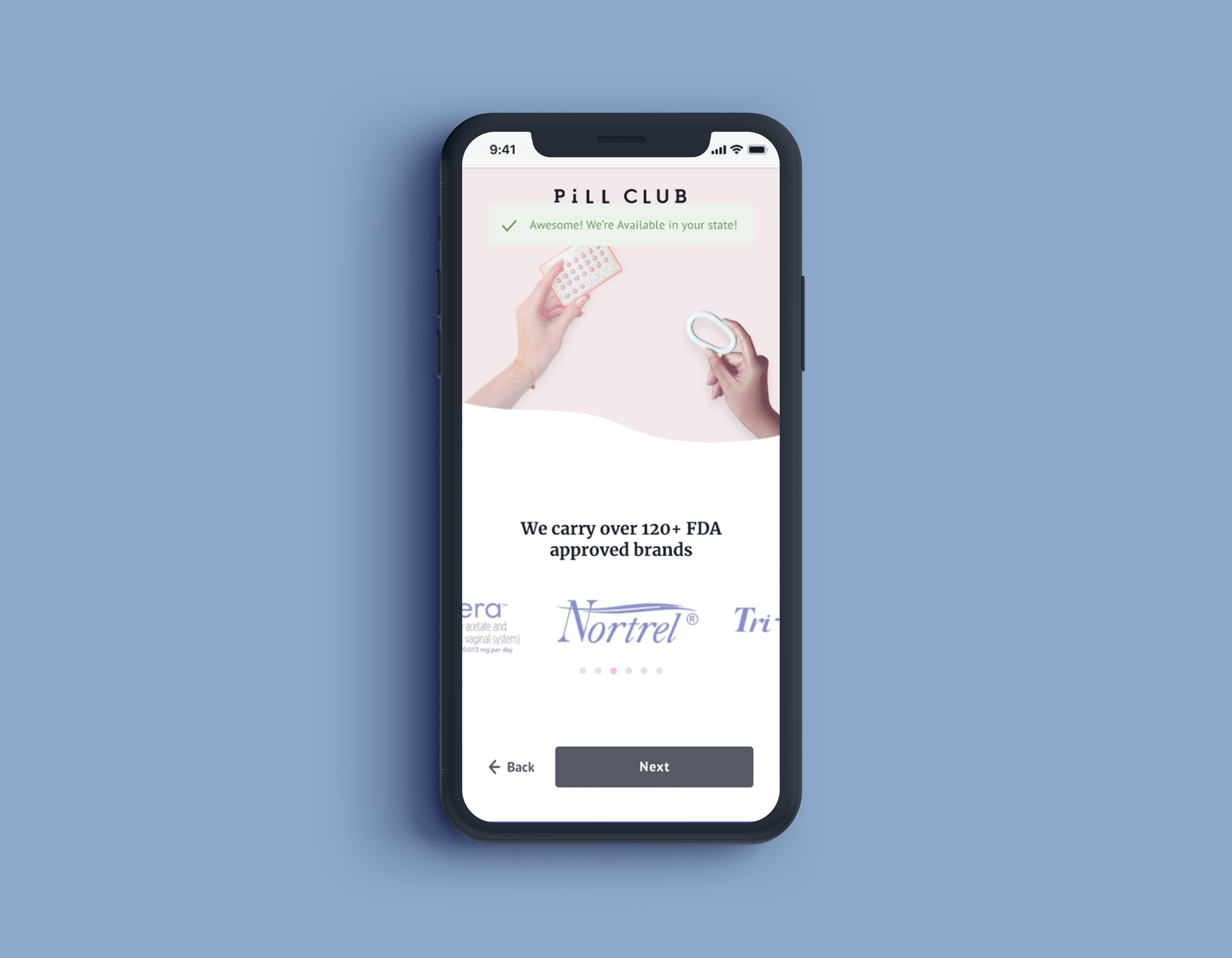 With this flow, the user can focus on one question at a time with sequential input fields. We also incorporate branding early on to engage the user and establish reputability by showing that we are FDA approved and carry 120+ birth control options.